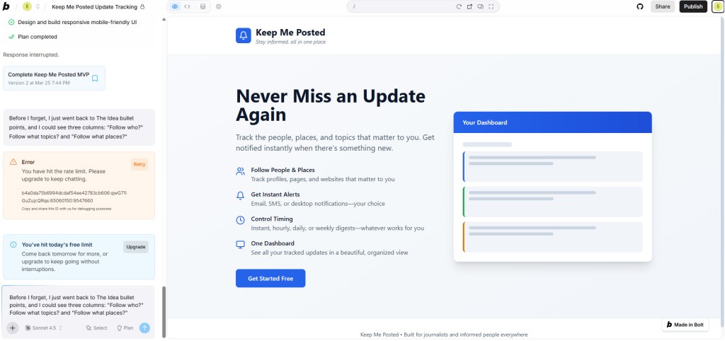 One Day 1 until I hit the freebie limits (of course) with Bolt, at least it engaged in some great, meaningful dialogue and drafted the home page idea shown in the screenshot above.